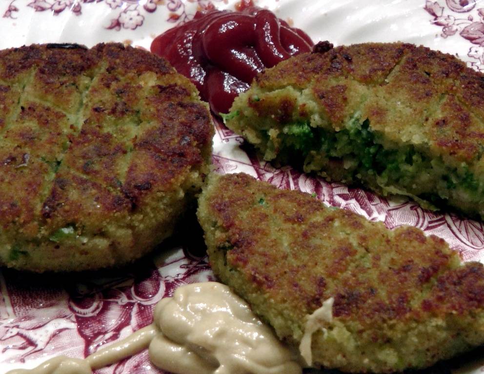 - Die erkaltete Masse auf acht Teile teilen, mit den Brokkoliröschen füllen, Laibchen formen, in Brösel wenden und bei mittlerer Hitze in Olivenöl backen.