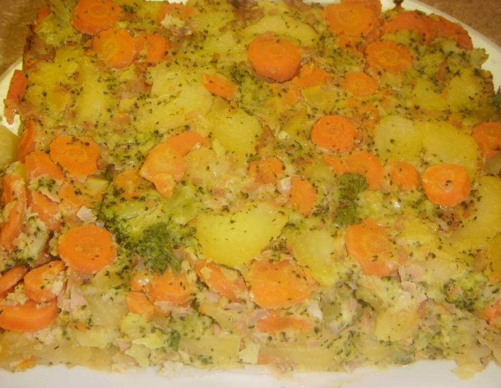 - Für den Kartoffel-Karotten-Auflauf die Kartoffeln, Karotten, Brokkoli, Schinken, Semmelbrösel, Käse, Salz, Pfeffer und Petersilie vermischen. Magermilch und Ei verquirlen, über das Gemüse geben und durchrühren.