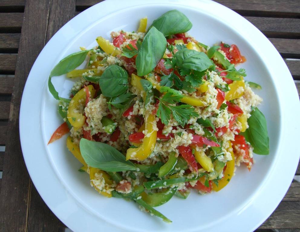 Besonders gut passen geröstete Pinienkerne zu dem Couscous-Salat. Auch Sonnenblumenkerne geben dem Salat eine herrlich nussige Note.