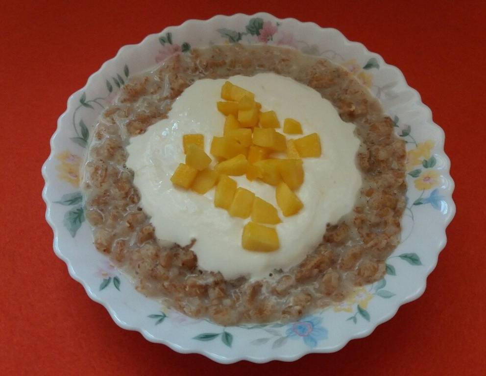 Wer möchte streut über die Dinkelflocken mit Mango-Topfen noch Kokosraspel. So wird es einen Hauch exotisch.