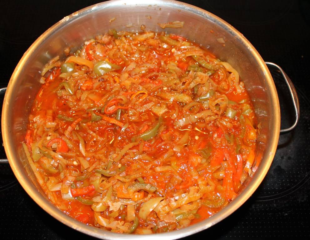 - Die Tomatensauce, Knoblauch, Paprikapulver, Salz, Pfeffer und Chilipulver untermengen und bissfest kochen. Das scharfe Letscho servieren.
