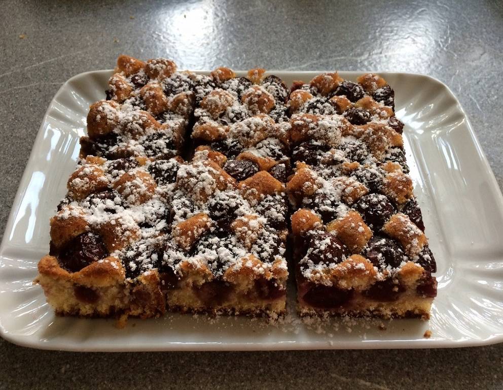- Mit Kirschen belegen. 25 Minuten backen und den ausgekühlten Vollkornkirschkuchen mit Staubzucker bestreuen.