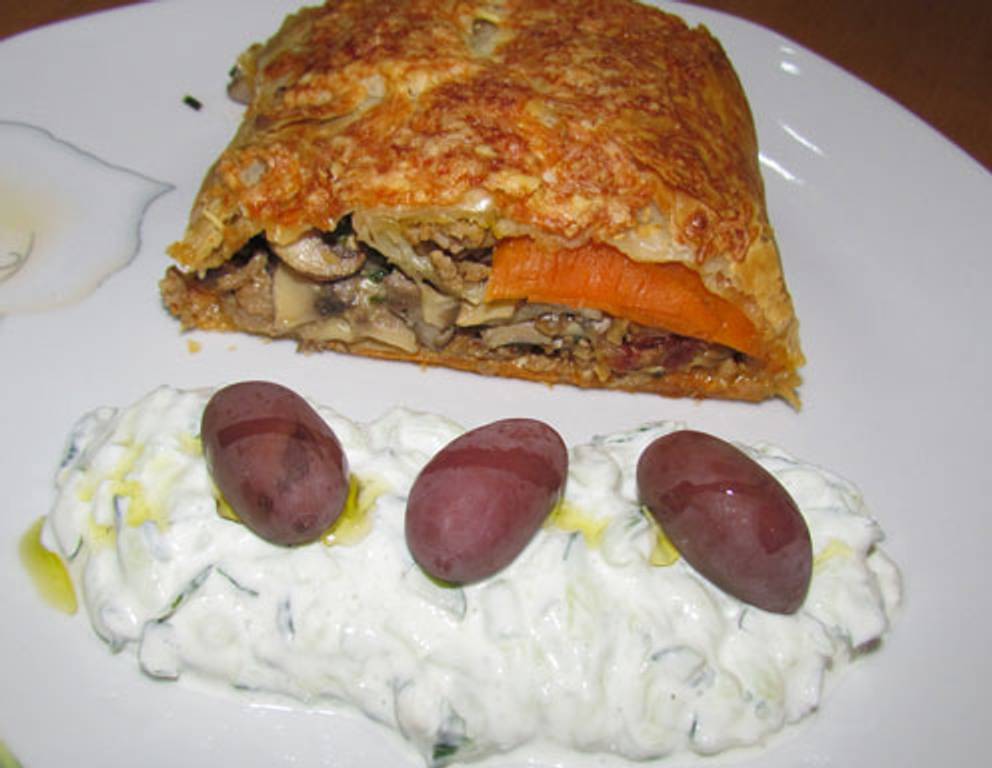 - Den faschierten Champignon-Strudel mit Tsatsiki servieren.