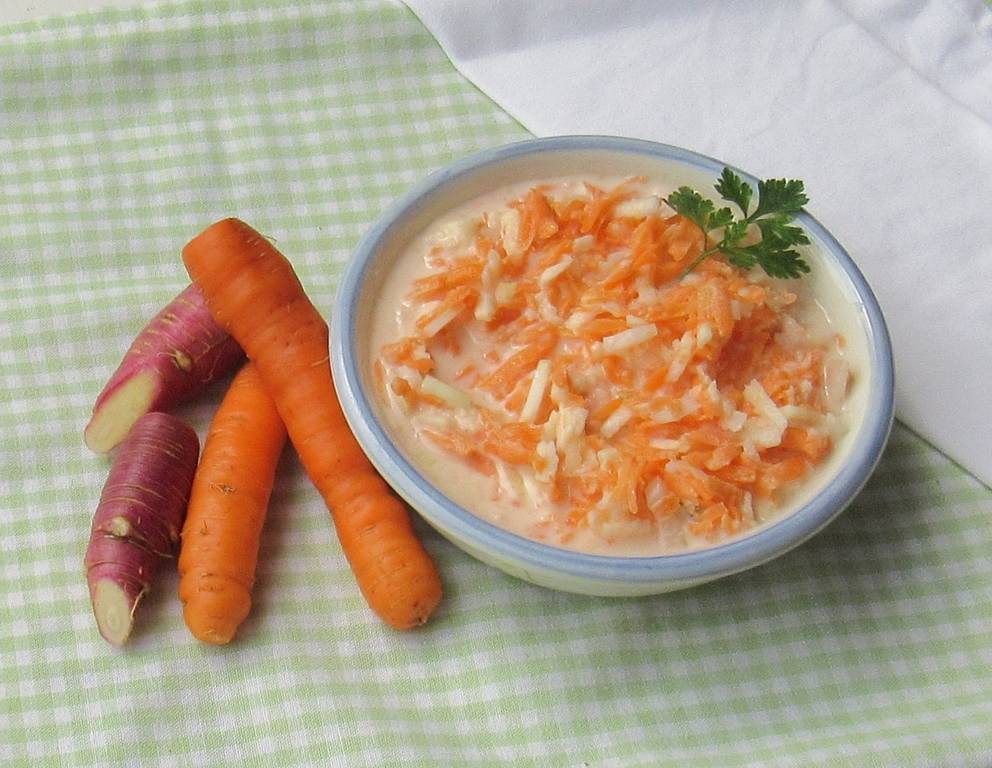 Damit das Vitamin A vom Körper aufgenommen werden kann, am besten noch ein paar Spritzer Olivenöl in den Karottensalat geben.