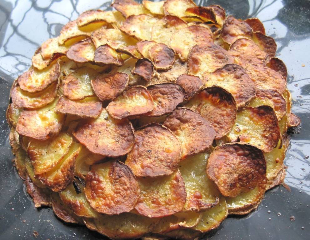 Außen ist die Kartoffel-Zwiebel-Torte sehr knusprig, innen allerdings weich. Je nachdem ob man mehr knusprige oder mehr weiche Anteile haben möchte, schichtet man die Torte höher oder vergrößert den Durchmesser.