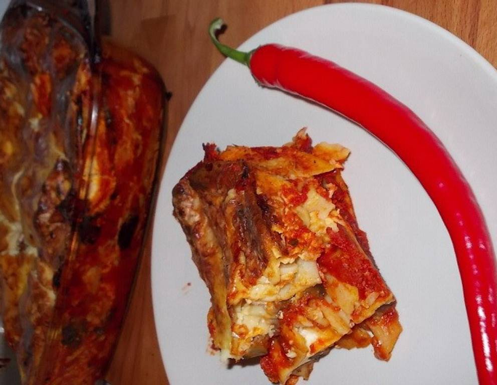 - Vor dem Essen ungefähr eine halbe Stunde vorher mit Alufolie abgedeckt aufwärmen und scharfe Auberginen-Lasagne servieren.
