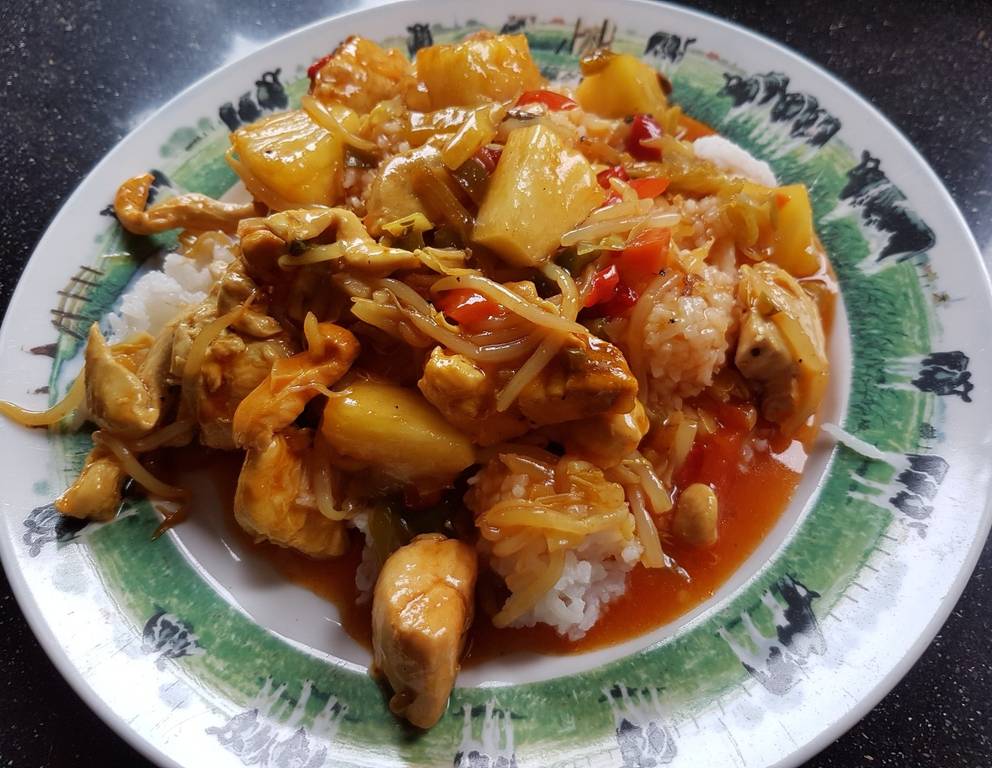 - Öl erhitzen, das Hühnerfleisch darin anbraten. Curry hinzufügen, Hühnersuppe aufkochen und zugießen. In ca. 20 Minuten gar schmoren. Ingwer klein würfeln und mit Sjoasauce zum Fleisch geben. Ananas würfeln, untermischen und das Huhn mit Ananas und Ingwer gut durchziehen lassen.