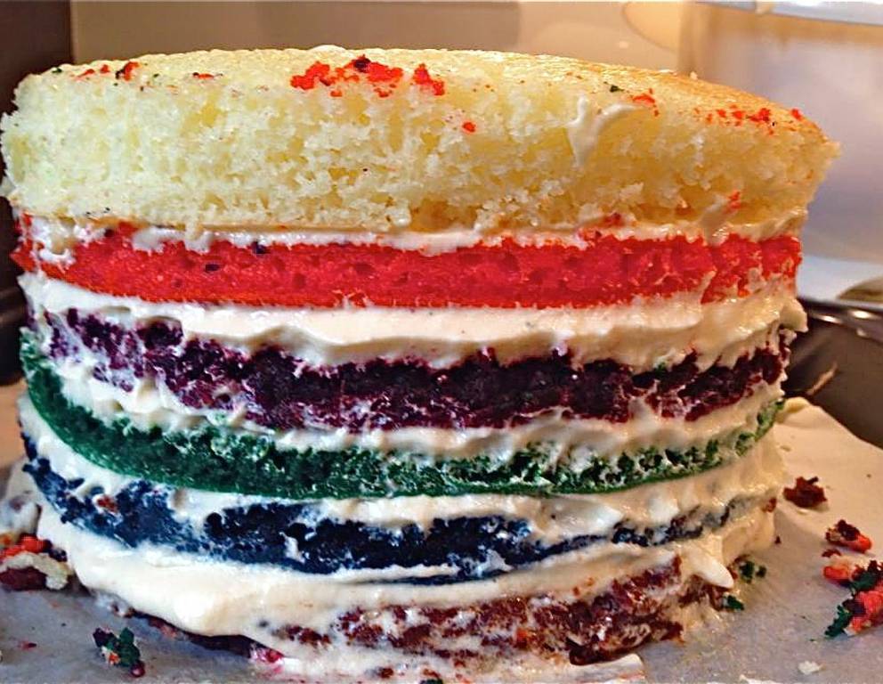 Die Regenbogentorte kann man mit verschiedenen Backfarben verziehen oder mit Kerzen und Sternspritzern. Hier ist der Fantasie keine Grenzen gesetzt.