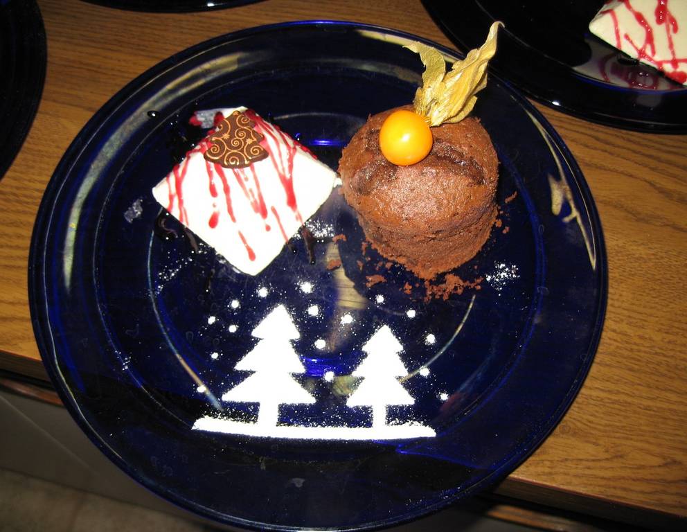 - Danach das Mehl und die Schokoladenbuttermasse unterrühren. Die Masse mit einem Dressiersack in einen Dessertring füllen und bei 250 °C Temperatur ca. 15 Minuten backen.