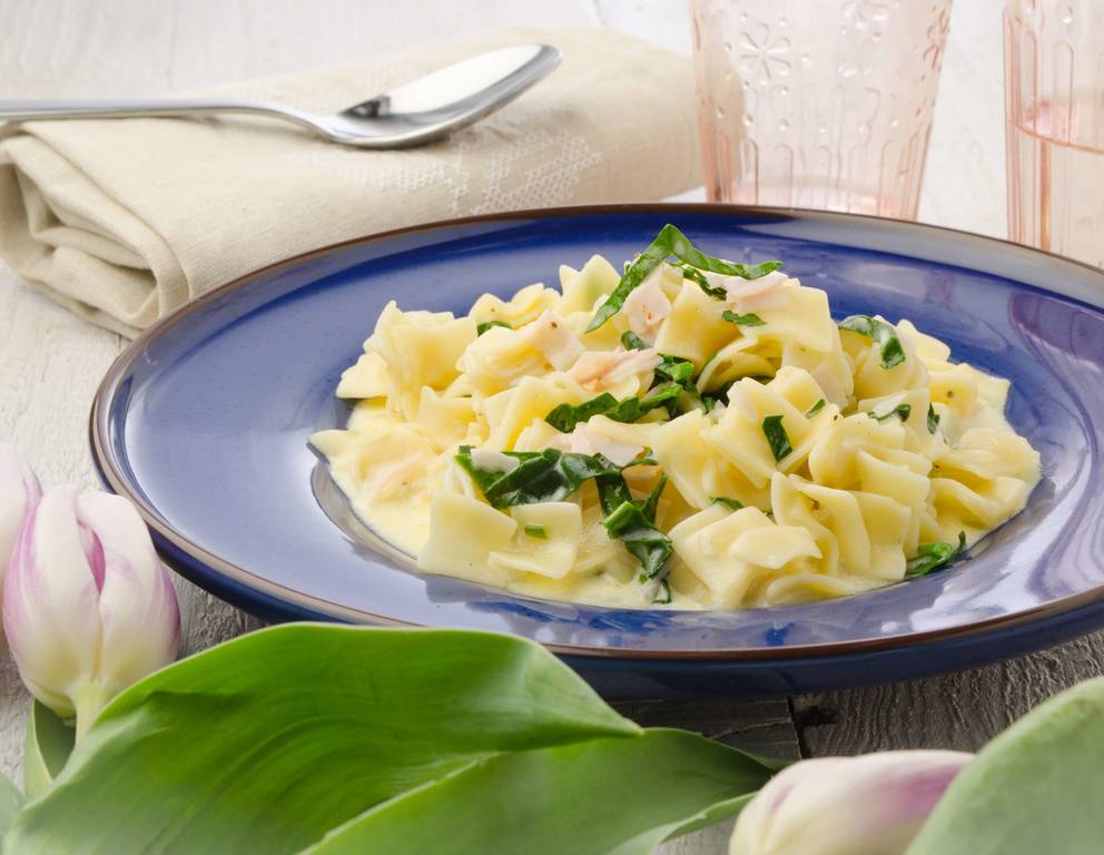 - Geselchtes und Bärlauch mit der Eimasse verrühren, in eine tiefe Pfanne geben und etwas einkochen lassen. Nun noch die Fleckerln unterrühren.