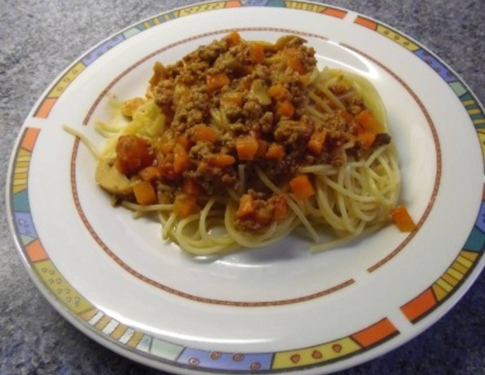 - Für die Spaghetti mit Fleisch-Gemüse-Sauce die Zwiebel hacken und im heißen Öl anbraten. Die Karotte in kleine Stücke schneiden und gemeinsam mit dem Faschierten zu der Zwiebel geben und ebenfalls anbraten.