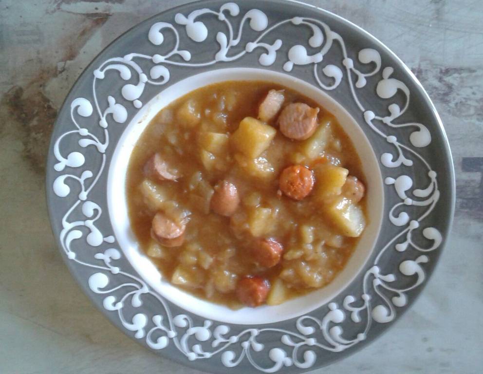 - Essiggurkerl blättrig schneiden und Extrawurst würfeln. Beides ins Erdäpfelgulasch geben und fertig garen.