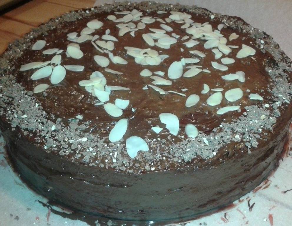 Wenn die Schokogussschicht noch etwas feucht ist, mit geriebener Schokolade bestreuen und mit Mandeln verzieren. Vor dem Verzieren und bestreichen mit Marmelade und Schokolade ist es sinnvoll die Haselnuss-Schoko-Torte auf ein Backpapier zu legen.