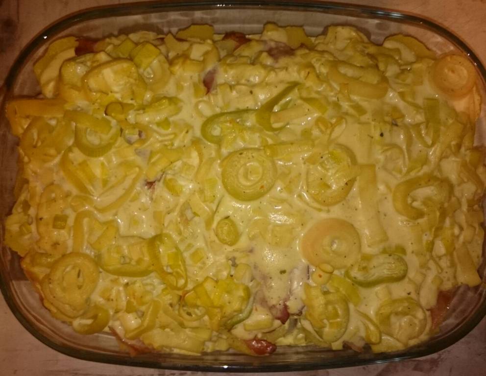 - Beides in Salzwasser überkochen (sollte nicht ganz durch sein) und in eine befettete Auflaufform legen. Den Schinken in kleine Würfel schneiden und über die Erdäpfel-Lauch-Mischung streuen.