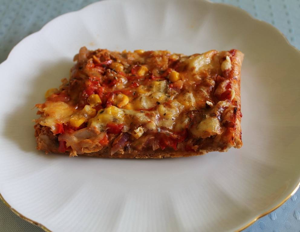 - Thunfisch, Mais, Paprikawürfel und Zwiebelringe auf dem Teig verteilen, mit Chilipulver bestreuen und den geriebenen Käse darüberstreuen.
