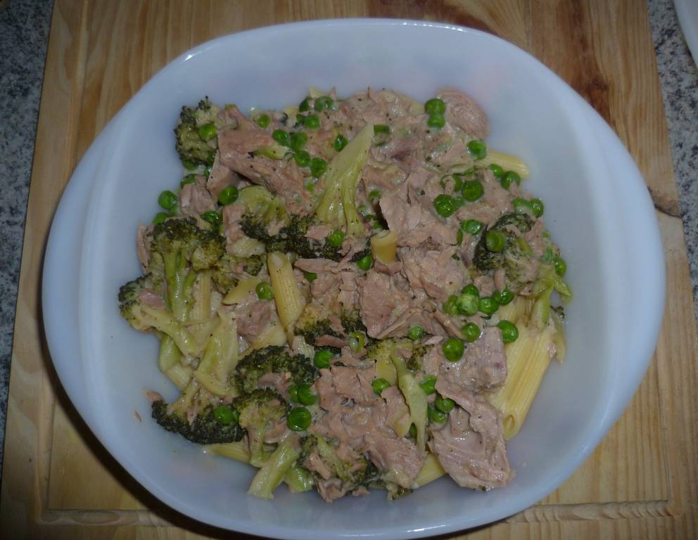 - Die Nudeln mit Thunfisch-Brokkoli-Erbsen-Sauce servieren.