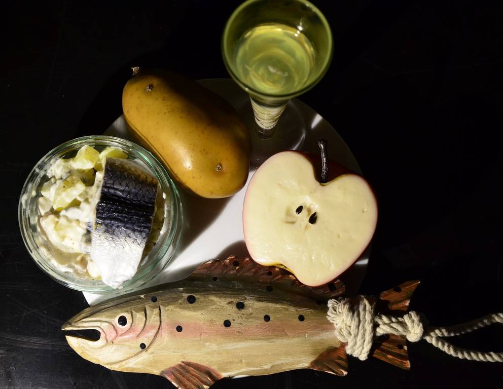 - Mayonnaise mit Sauerrahm verrühren, mit Äpfel, Kartoffeln, Essiggurken und Heringsstücke vermischen. Falls notwendig, die Konsistenz mit Heringsmarinade korrigieren.