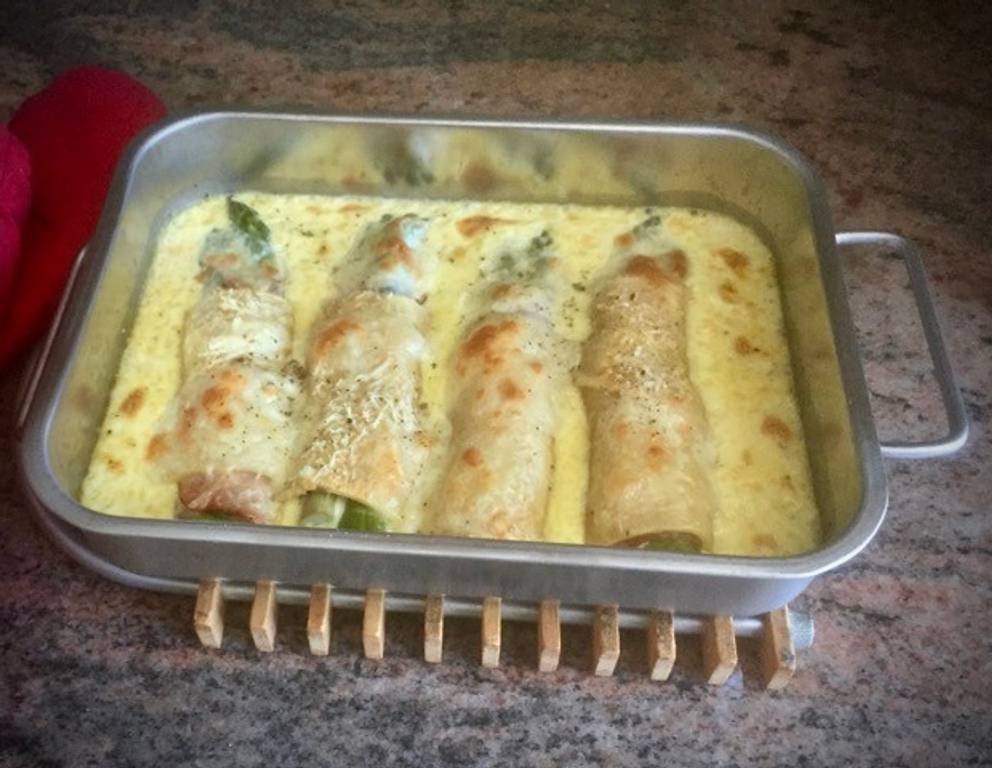 - Je 3 Stangen Stangenspargel zu Beginn in Schinken, dann in die Lasagneblätter einschlagen. Stangenspargel-Cannelloni aneinander in eine gefettete Gratinform legen.