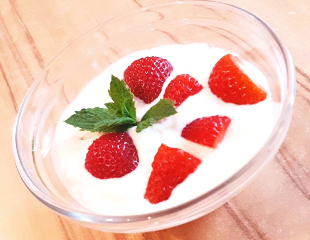 - Die Joghurtcreme mit Schlagobers vermengen, in Schalen anrichten und die Erdbeeren darübergeben. Mit Minze garnieren.