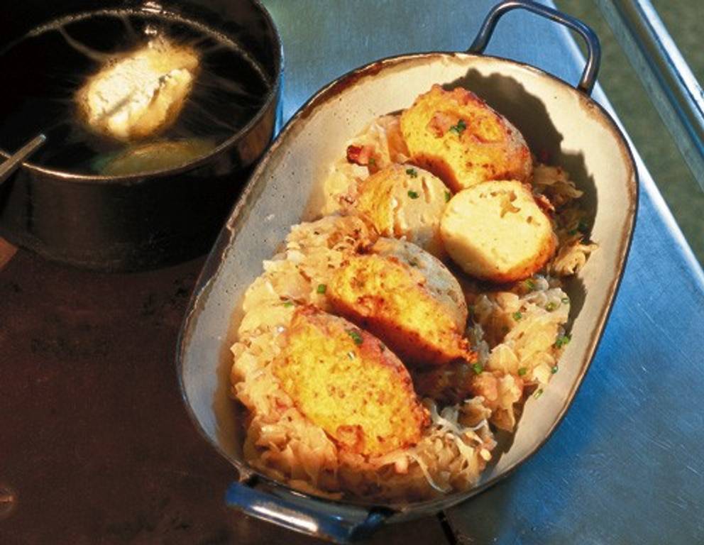 - Topfen, Sauermilch, Mehl und Prise Salz zu einem nockerlähnlichen Teig vermischen und 15 Minuten rasten lassen. Dann löffelweise kleine, eher längliche Nocken (à ca. 25 g) in heißem Fett bei 150 °C ca. 8-9 Minuten goldbraun herausbacken. Herausheben, auf Küchenkrepp abtupfen und mit Sauerkraut servieren. Für das Sauerkraut das gekochte Kraut abtropfen lassen. Speck in heißem Schmalz anbraten, Sauerkraut zugeben und kräftig durchrühren.