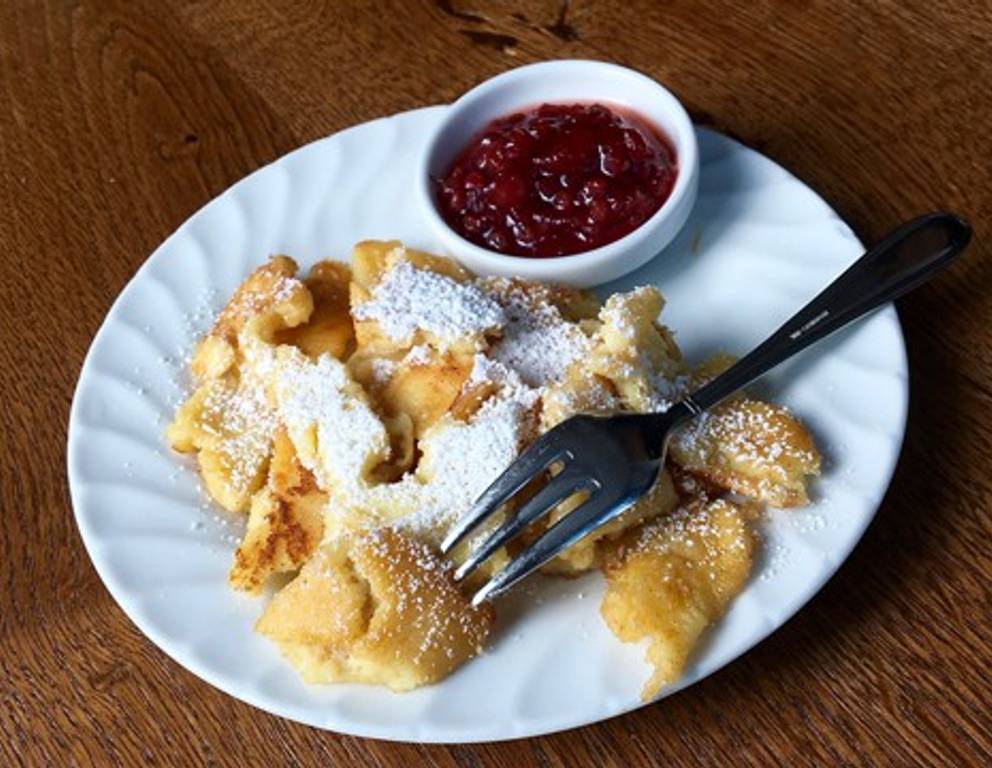 - Schmarren auf der Stelle anrichten und dick mit Staubzucker bestäuben. Dazu schmecken Preiselbeeren.