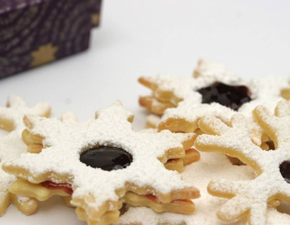 - Nach dem Auskühlen die Kekssterne mit dem Loch mit Staubzucker bestreuen. Mit Uhudler-Marmelade oder anderer dunkler Marmelade jeweils einen Keksboden mit einem gelochten Stern zusammenkleben.