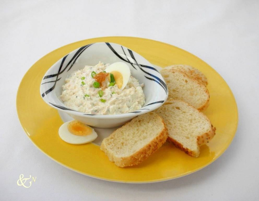 - Mit Creme Fraiche und Sauerrahm zu einem streichfähigen Fischaufstrich verrühren. Abschließend mit einem Spritzer Zitronensaft und den gehackten Kräutern würzen.
