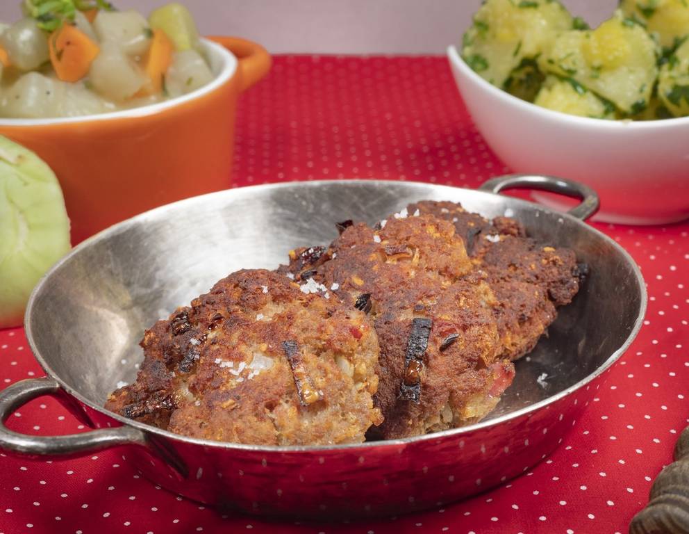 - Aus der Faschierten Masse Fleischlaibchen formen und diese in einer Bratpfanne in Butterschmalz von beiden Seiten braten.