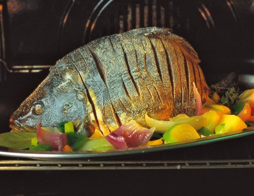 - Den vorbereiteten Karpfen schröpfen oder bereits vom Fischhändler schröpfen lassen. Innen und außen gut salzen und mit Zitronensaft beträufeln. Einige Thymianzweige und Lorbeerblätter in die Bauchhöhle des Karpfens legen und den Fisch ca. 30 Minuten marinieren lassen. Karpfen beidseitig mit Mehl bestauben, in eine passende Pfanne (Fischpfanne, Bratenpfanne oder auf ein tiefes Backblech) setzen. Erdäpfel schälen, einige Minuten vorkochen und in kleinere Stücke schneiden. Zwiebeln in Ringe, geputzte Paprikaschoten in Streifen schneiden, Knoblauch fein hacken und alles rund um den Fisch verteilen. Mit Weißwein begießen und im vorgeheizten Backrohr bei 200-220 °C auf der unteren Schiene ca. 40-50 Minuten knusprig braten. Nach Belieben mit ein wenig Suppe untergießen, aber nicht übergießen. Wenn möglich, den Karpfen im Ganzen stehend auf einer Platte anrichten. Gemüse um den Karpfen drapieren, mit gehackter Petersilie bestreuen und servieren.