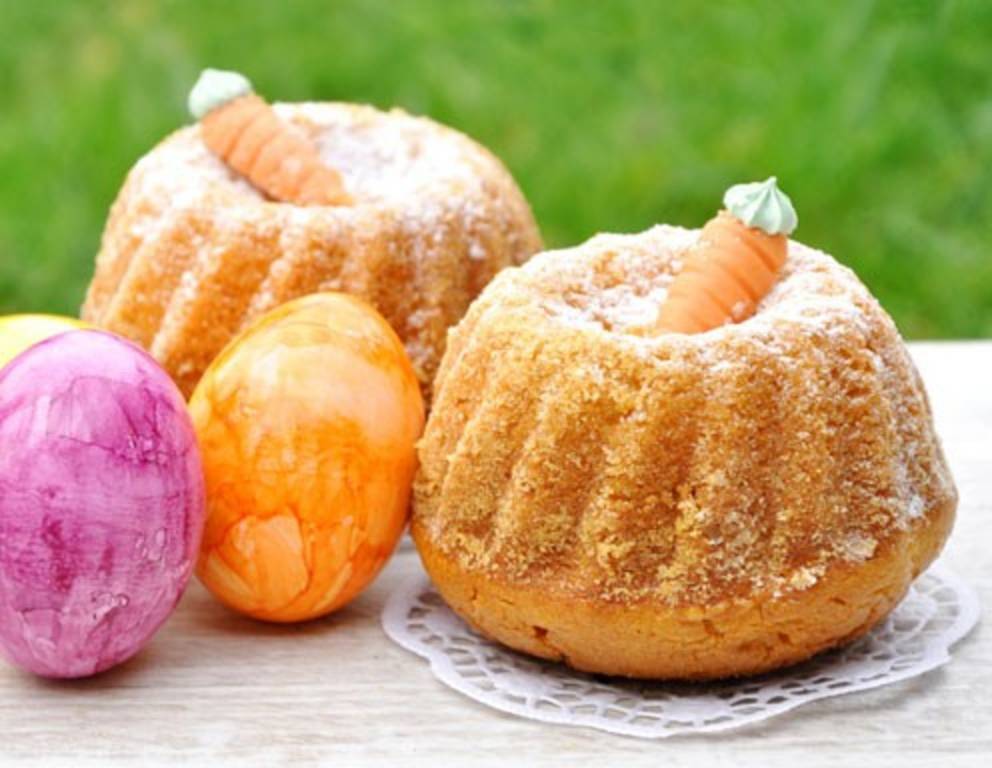 - Zu guter Letzt Eiweiß steif aufschlagen, unter Weiterschlagen den übrigen Zucker einrieseln lassen. Die Eiweißmasse unter die Karottenmasse ziehen. Den Teig in kleine, gefettete, mit Semmelbröseln ausgestreute Gugelhupfförmchen füllen (bei Silikonförmchen ist das Fetten und Ausstreuen nicht notwendig) und bei 180 Grad ungefähr 20-30 Minuten backen. Am besten eine Stäbchenprobe machen.