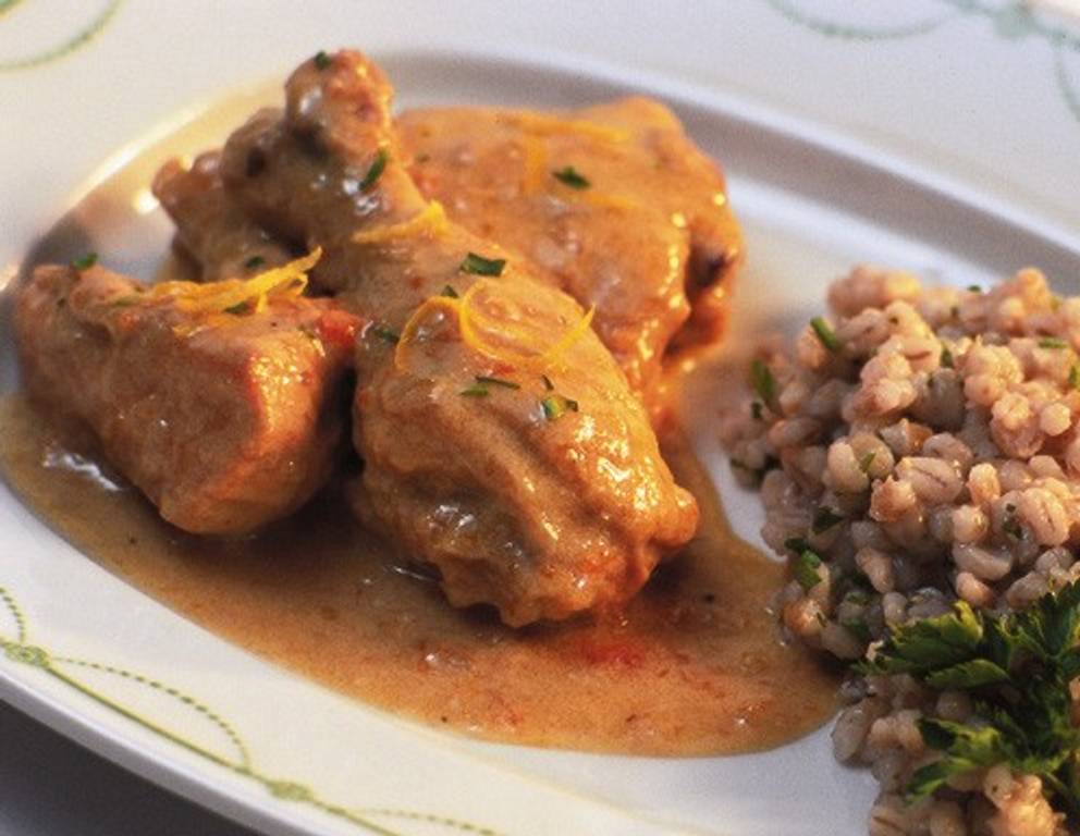 - Das Huhn waschen, trockentupfen und in acht Teile tranchieren. Kaltes Wasser mit Hühnerklein (samt Fett) und Gemüseabschnitten (Reste vom Putzen) aufsetzen und zu einer Hühnersuppe kochen. Suppe abseihen und etwa 500 ml bereithalten. Hühnerteile mit Salz, Pfeffer und Muskatnuss würzen. In Mehl wenden und in einer Pfanne in heißem Fett rundum anbraten. Herausheben, Zwiebeln und geschabtes Gemüse im selben Fett anrösten. Mit Schilcher ablöschen und etwas Suppe zugießen. In eine Kasserolle mit dickem Boden umfüllen und die Hühnerteile einlegen. Zugedeckt ca. 1 Stunde weich dünsten. Dann die Hühnerteile wieder herausnehmen. Mit restlicher Suppe aufgießen, Sauerrahm mit etwas Mehl verrühren und die Soße damit binden. Nochmals gut durchkochen. Mit geriebener Zitronenschale abrunden. Die Hühnerstücke in der Soße nochmals erwärmen. Mit gehackter Petersilie bestreut zu Tisch bringen.