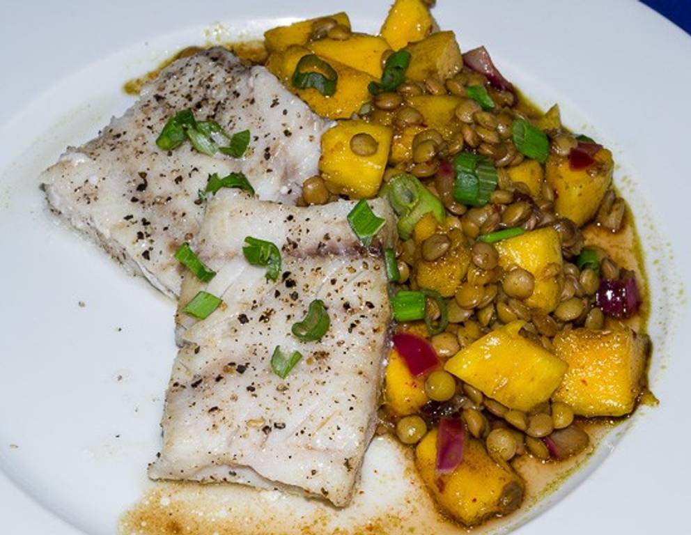 Servieren Sie den Rotbarsch auf asiatischem Linsengemüse mit Schnittlauch bestreut.