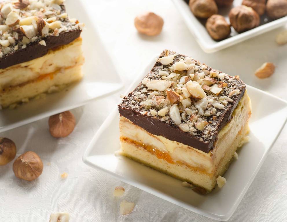 - Die Füllung aufschlagen, auf die abgekühlte Teigplatte streichen, mit Bananen belegen und die Schokoglasur drübergeben.
