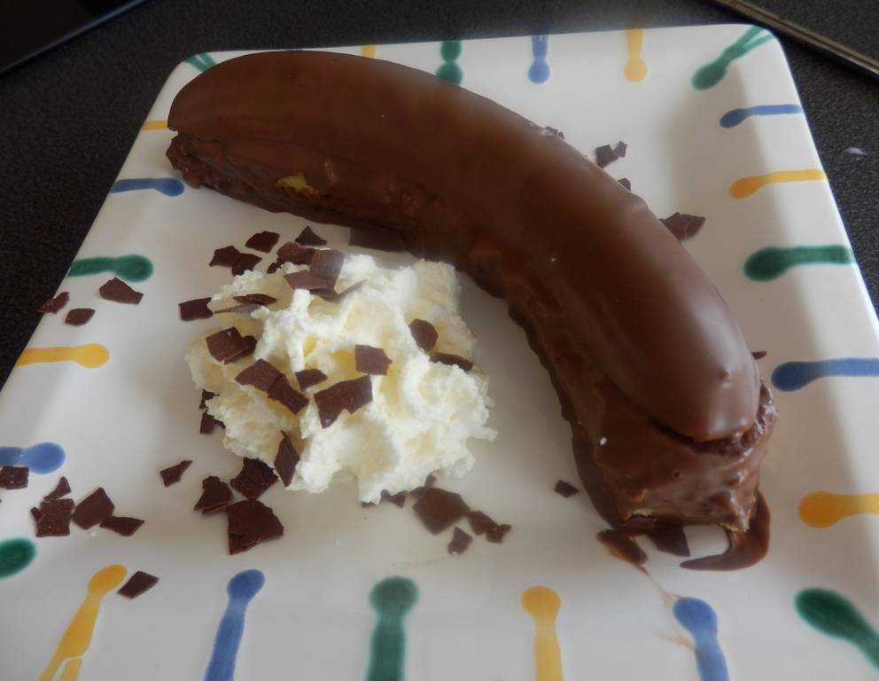 - Zum Schluß noch mit einem Messer ausschneiden und mit Schokoladenglasur überziehen. Die Schokobanane mit Schlagobers und Schokoflocken servieren.