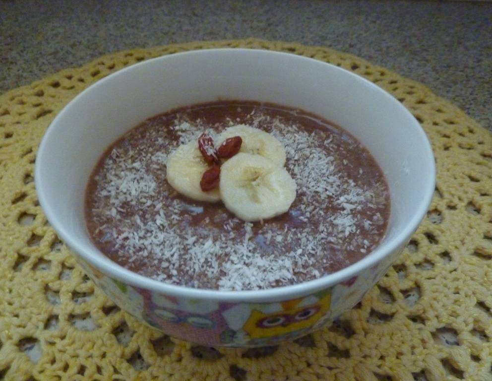 - Für das Bananenhaferfrühstück Haferflocken mit Milch, Wasser und Kakao unter Rühren aufkochen und ca. 5 Minuten unter ständigem Rühren weiterkochen lassen, bis die passend Konsistenz erreicht ist.
