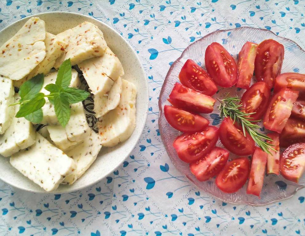 - Für den marinierten Halloumi den Halloumi in Scheiben schneiden und auf einem Rost grillen. Zitronen halbieren, mit der Schnittfläche auf den Rost legen und mitgrillen.