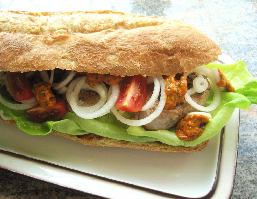 Zum Essen nimmt man das ganze Supersandwich mit Paprika-Knoblauchsauce entweder wieder auseinander und isst mit Messer und Gabel, oder man schafft es von dem Riesenbrötchen abzubeißen.