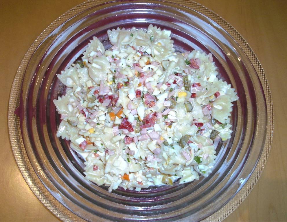 - Für den bunten Farfalle-Salat mit Mayonnaise und Chili die Farfalle in Salzwasser bissfest kochen und auskühlen lassen. Inzwischen die restlichen Zutaten kleinwürfelig schneiden und mit den Farfalle vermischen.
