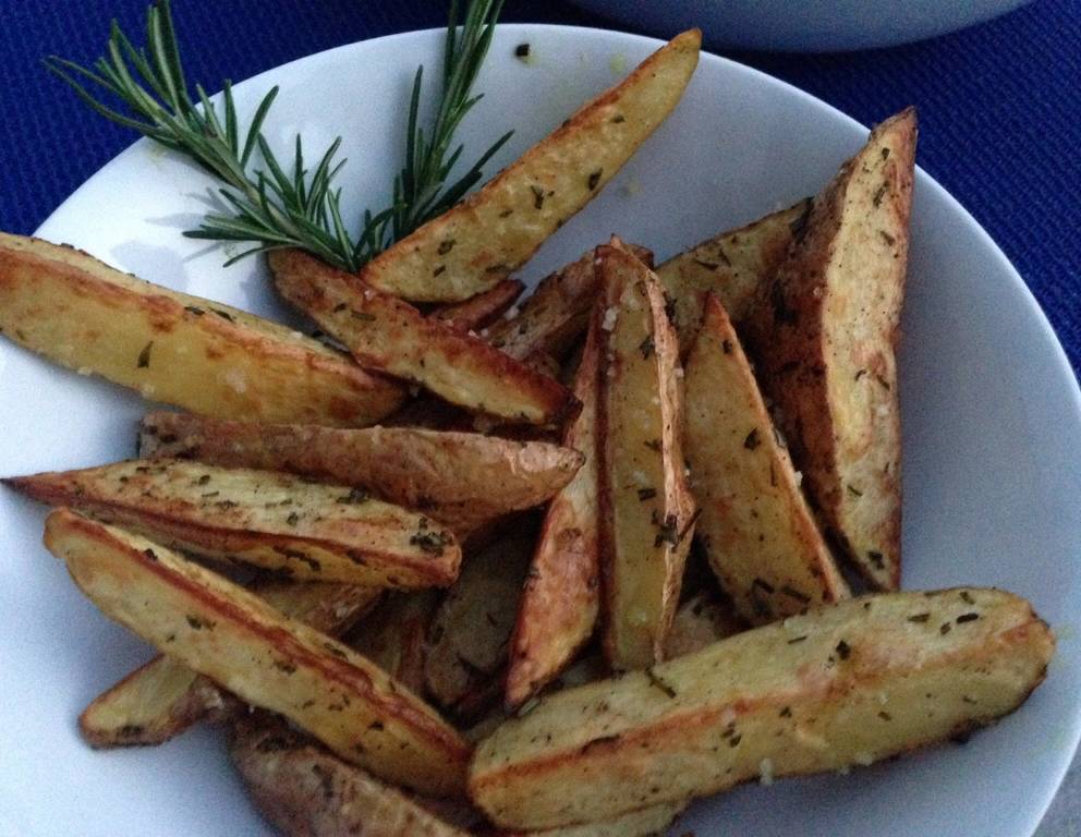 - Für die Erdäpfelwedges das Backrohr auf 220 Grad vorheizen.   Die sehr gut gewaschenen Erdäpfel der Länge nach sechsteln.   Den Rosmarin von den Stielen zupfen und hacken.