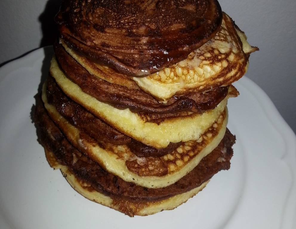 Schoko-Vanille Pancakes schauen besonders gut aus, wenn man sie abwechselnd schichtet. Frische Beeren und Beerensoße passt hervorragend dazu.