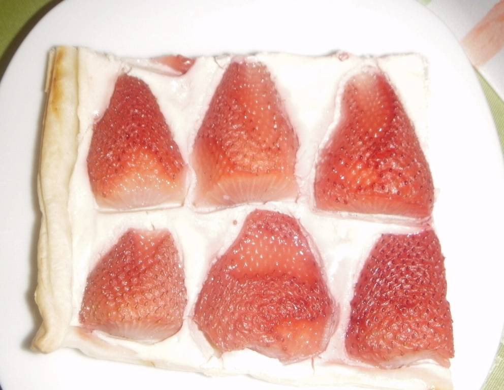 - Die Erdbeeren waschen und in der Mitte durchschneiden. Den Topfen mit dem Eiklar, dem Zucker, Zitronenschale und Öl gut vermischen und auf dem Blätterteig verteilen, darauf die Erdbeeren nebeneinander darauflegen und im Rohr bei 190 Grad 25 Minuten backen.