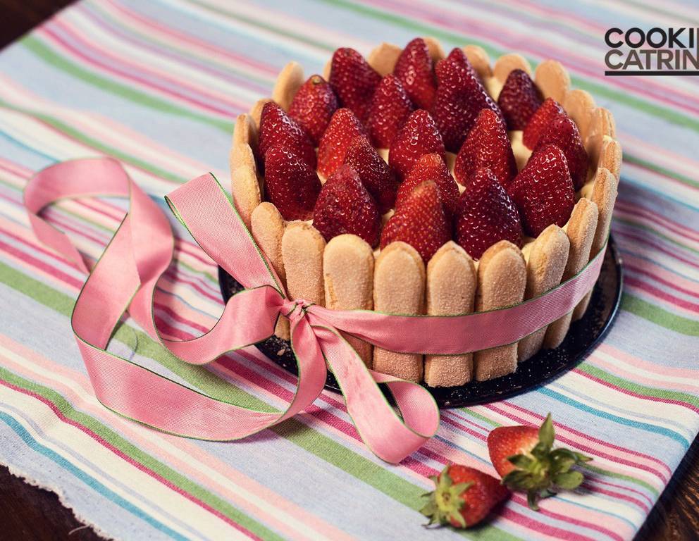 - Kurz vor dem Servieren aus dem Kühlschrank holen, 500 g Erdbeeren von den Stielen befreien und auf die Creme auf der Charlotte mit den Spitzen nach oben stellen.