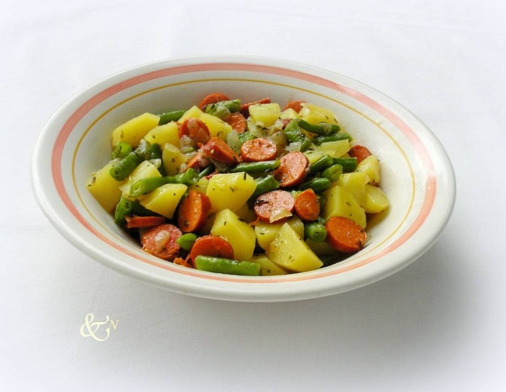 Zum Erdäpfel-Fisolen-Topf passt frisches Weißbrot. Statt den Frankfurtern kann man auch eine Debreziner verwenden oder man nimmt Speckwürfel.
