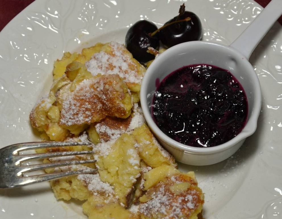 Der Kaiserschmarren mit Kirschenröster ist eine sommerliche Variation des Klassikers. Sind keine Kirschen zur Verfügung, so kann anstattdessen auch Zwetschkenröster dazu serviert werden.