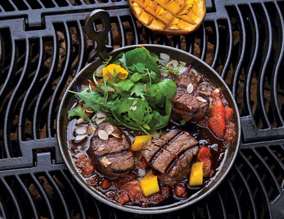 - Mangos indirekt ca. 20 Minuten grillen, dann mit einem Löffel Fruchtfleisch herausnehmen; in einer Gusseisenpfanne Zucker karamellisieren, die Grapefruitfilets dazugeben, kurz durchschwitzen, aufpassen, dass sie nicht schwarz werden.