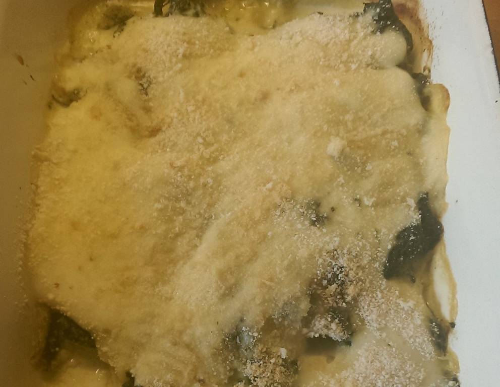 - Den Spinat auf den Fisch geben und darüber das Bechamel gießen. Mit Brösel, Parmesan und Butterflocken belegen und bei 160 °C Heißluft ca. 20 Minuten überbacken.