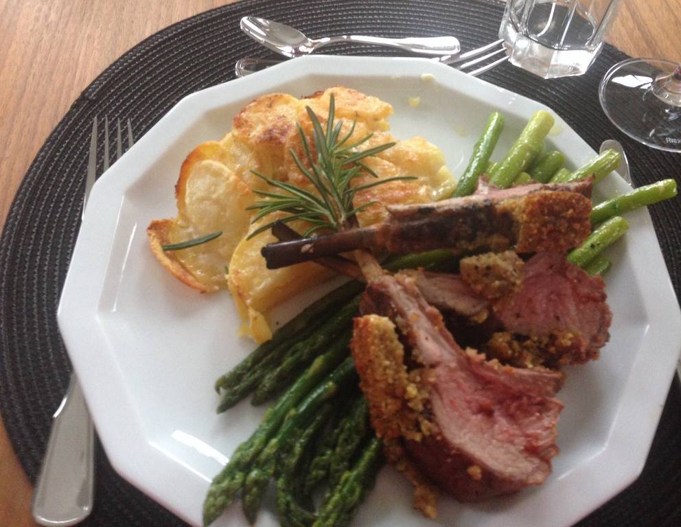 - Den fertigen Lammrücken mit dem Spargel und dem Erdäpfelgratin auf heißen Tellern anrichten.   Mit einem Rosmarinzweig garnieren!