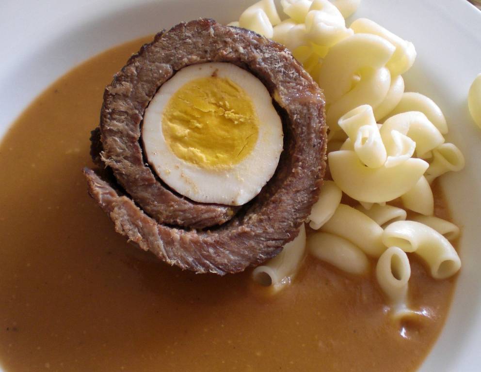 - Schnitzel auf einer Seite mit der Marinade bestreichen. Das gekochte Ei darauflegen und mit dem Schnitzel umwickeln. Die Roulade mit Garn zusammenbinden.