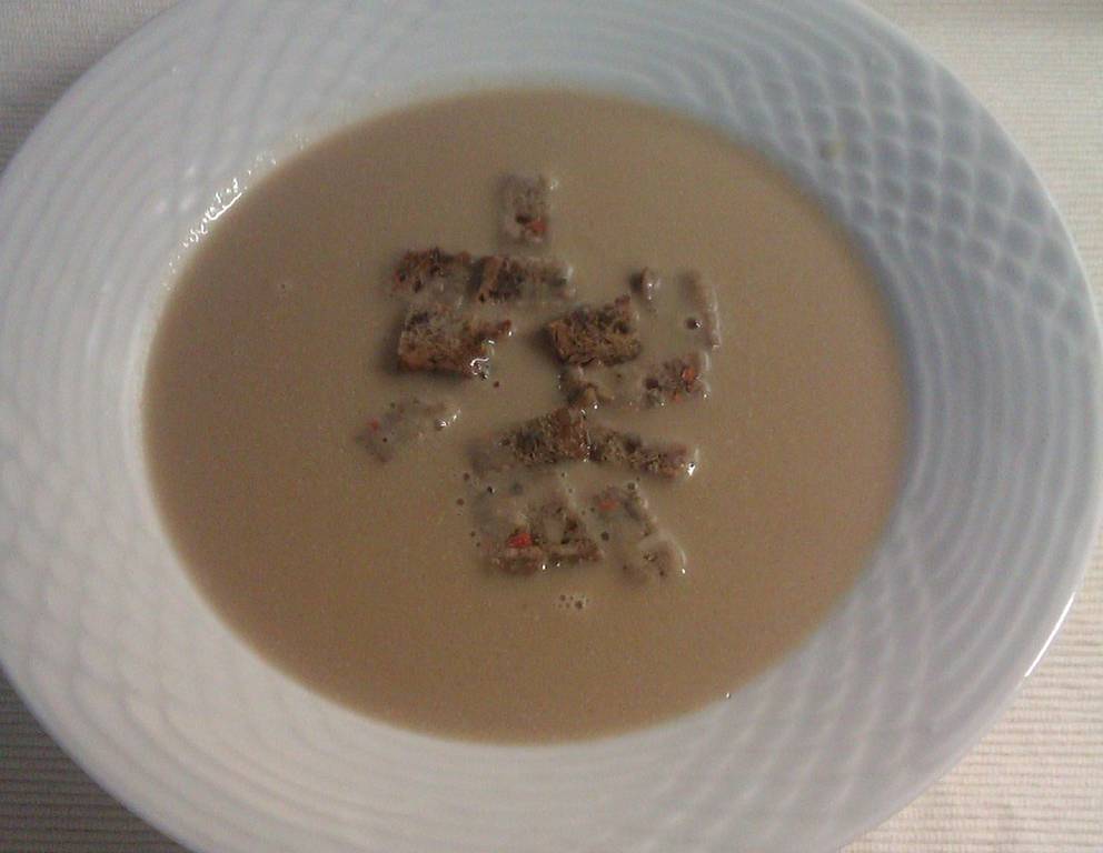 - Auf sehr kleiner Flamme etwas einreduzieren lassen. Suppe und Schlagobers dazugeben. Mehl in etwas kalten Wasser auflösen und in die kochende Suppe mit dem Schneebesen einrühren.