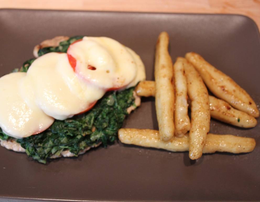 - Fertig sind die herrlichen Schnitzel mit Spinat-Tomate-Mozzarella überbacken.